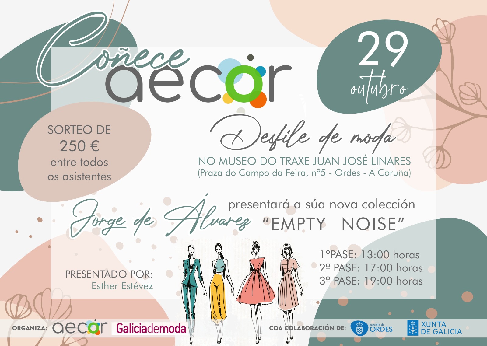 Conducirá el evento Esther Estévez, presentadora de “Dígocho eu” de la TVG, y contará con la participación de Jorge de Álvarez, destacado diseñador gallego que nos presentará su colección” EMPTY NOISE”, además de con 18 modelos profesionales. A mayores, y para que este espectáculo sea memorable, estarán al mando grandes profesionales de “Galicia de Moda”.